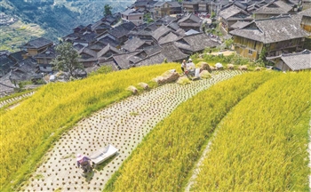 9月18日,贵州省黔东南苗族侗族自治州从江县加榜乡加车村的村民在田间抢收稻谷(无人机照片)。