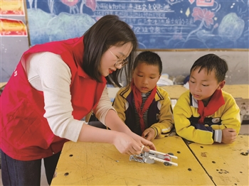 近日,西秀区“萤火之光”志愿服务团队到岩腊乡九年制学校开展送课进乡志愿服务活动。活动中,志愿者们精选心理健康、体育运动、艺术审美、科学实践等课程,助力孩子们在自信独立、创新思维、团结合作、交流沟通、动手实践等方面综合素质的提升。 □记者 胡典 摄