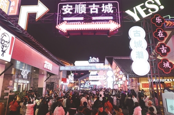□本报记者 李伟 文/图 1月31日,大年初三,记者来到安顺古城历史文化街区,夜幕之下,灯火辉煌,游人如织,浓厚的节日氛围扑面而来。 站在安顺古城历史文化街区入口,抬头便是高高挂起的灯笼,红色的灯光映照着青石板路,仿佛为古城披上一层喜庆的红色外衣,街道两侧,游客们兴致盎然地拍照,留下欢庆的光影。目光前移,见游客集聚在一起,观看地戏表演,表演者们生动演绎了忠诚良将的故事。 “一开始,我看不懂,但是通过讲解员的讲解,我看明白了所表演的故事。”来自四川的游客胡一波说,他是第一次看地戏表演,安顺地戏让他增长了见识。 继续往前走,路过三元桥,桥上站满了游客,贯城河里,一只小船轻轻荡漾着,身穿汉服的舞者,在船头翩翩起舞,伴随着桥面喷洒的水柱以及河岸璀璨的灯光,画面如梦如幻,引得游客掌声连连。 走进名为“巷往”的巷子里,街巷两旁古朴的建筑被改造成数十间有特色的文创店,一个人的安顺书吧、童年文创、老百货商店、安顺有礼、屯堡木缘阁、龙腾石文化展馆…… “花80元就能体验做木雕,非常有意义。”在屯堡木缘阁,来自兴义的游客王洁说,这是在其他地方无法体验的,这次来安顺,很值。 “巷往”尽头是安顺文庙和习安坊,文庙广场中央正在进行地戏表演,和古城入口的地戏表演不太一样,此处的地戏表演是高台地戏,高台地戏俗称“摆阵”,精彩的表演吸引着游客们的眼球,喝彩声此起彼伏。 走进安顺文庙,一只戴着墨镜的招财猫,因其酷帅的表情吸引不少人上前摸头合影。络绎不绝的游客在文庙祈福,此外,还有不少游客在文庙观看免费画展。安顺文庙的对面,习安坊内同样热闹非凡,市井杂耍、古装情景剧、绣球招亲等一系列活动精彩上演。 (下转4版) |